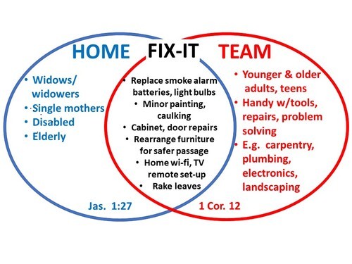 The Home Fix-It Team is open to all BBC members/attenders (young and older adults, teens) to work together in small teams to meet these needs. Team members should be comfortable and handy with tools, making repairs, and problem solving. Time commitment typically involves less than one half day per month (weekdays or weekends).
